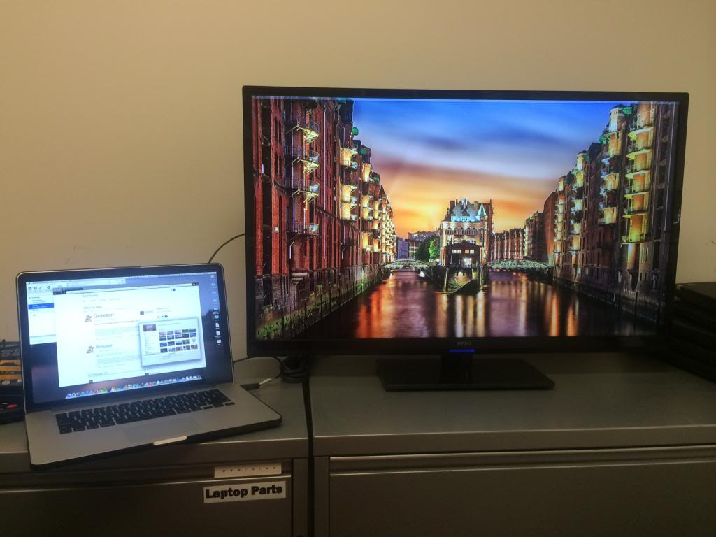 Got my boss to approve getting the Seiki SE39UY04 from Amazon when they had it listed at $399 a couple of weeks back. I still havent made room at my desk yet, but I finally connected my 15-inch rMBP to it today to see what it looked like. I fell in love. The picture doesnt do it justice, honestly