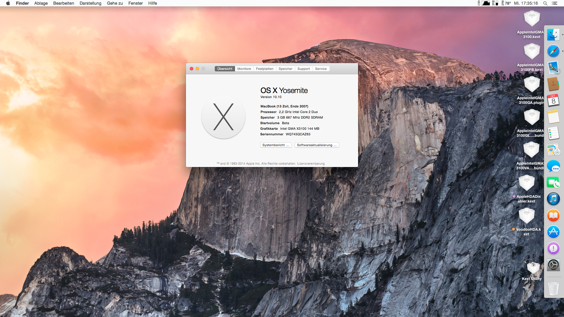 That's awesome that you were able to use the 64-bit kexts from 10.6.2 for Yosemite – I downloaded the combo update and used the "file" command to confirm that they are indeed 64-bit, whereas the kexts included with MLPF are 32-bit alpha drivers from a 10.7 preview – but getting Quartz Extreme to work was the hard part! You can tell hardware acceleration isn't enabled because the dock and menu bar are a solid white. The issues people had with that were that full-screen Netflix and YouTube playback is too slow on the MacBook 3,1 hardware, and of course a general lack of snapiness in everyday computing.Sorry for double post, but its important to anyone. Tried an older version of VLC, I get an error which says I need Open GL Quartz Extreme acceleration. So do I just switch the Open GL bundle?
