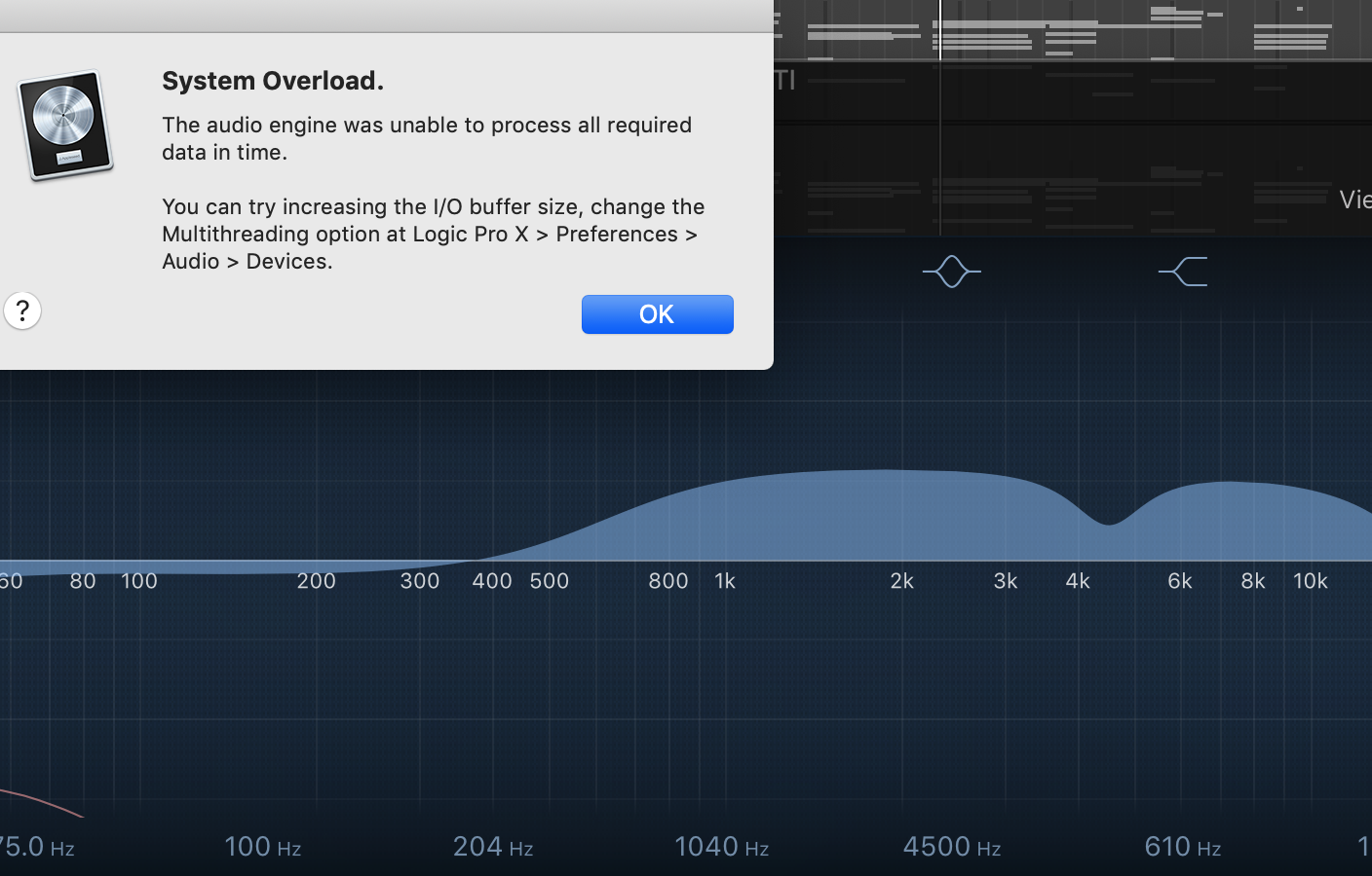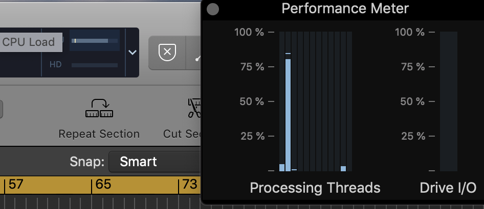 MacMini 10.14.6 Processor 3.2 GHz Intel Core i7 32 GB RAM running Logic Pro X nothing else TWO audio tracks with logic EQ on each channel and master bus. Logic preferences IO buffer size set to max and changed multithreading options. HOW IS IT POSSIBLE this maxes out already? Can someone pls advise. Thanks
