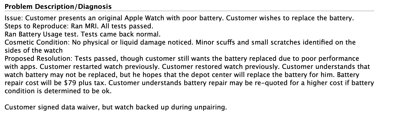 What I thought would be a simple in and out deal turned into over an hour of diagnostics and the Apple Store employee constantly telling me that the battery tests fine and that they likely won't replace the battery because it passes diagnostics, but I can send it to the depot anyway and "hope" they replace it. He also noted on the work order that Apple may decide to charge me more to replace the battery if they replace it anyway and the battery tests fine.