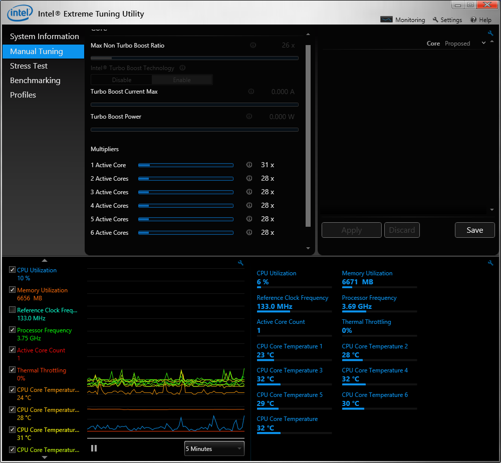 By raising the multiplier for Single Core operations to from 28x to 31x, I've essentially boosted single core performance from a max of 3.72Ghz to a max frequency of 4.25 Ghz. Multi-core performance was also increased from 3.59Ghz to 3.72Ghz.