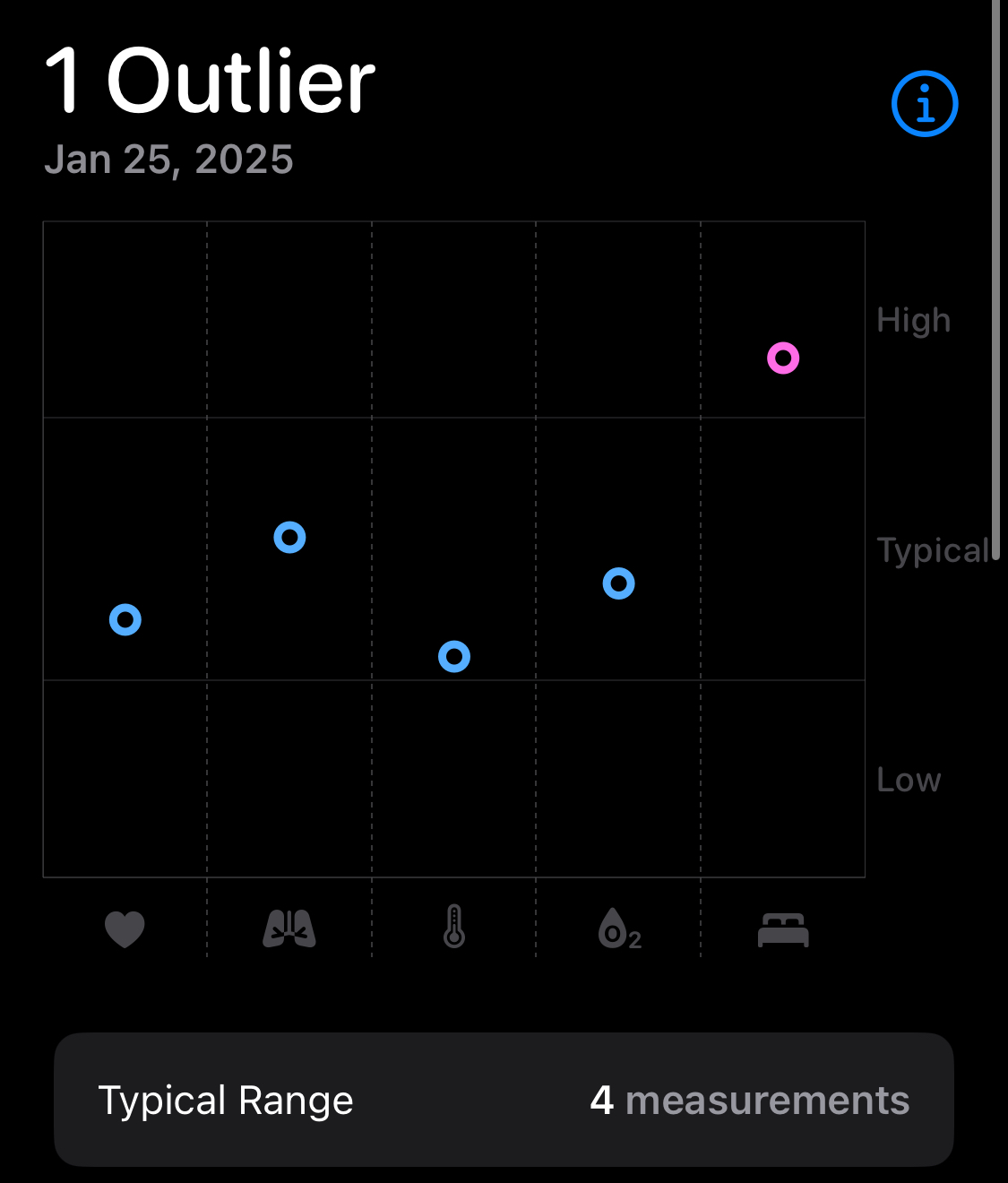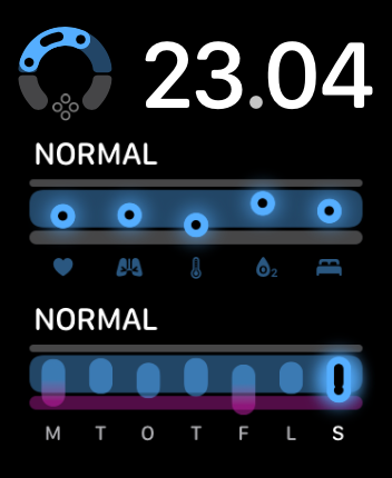 Look at the "23:04" example: The leftmost dot represents my wrist temperature.The measurement is (comparatively) much lower than my other vitals so it gets a circular dot. The measurement is quite low, and the dot representing it on the horseshoe is therefore represented by the leftmost black dot.