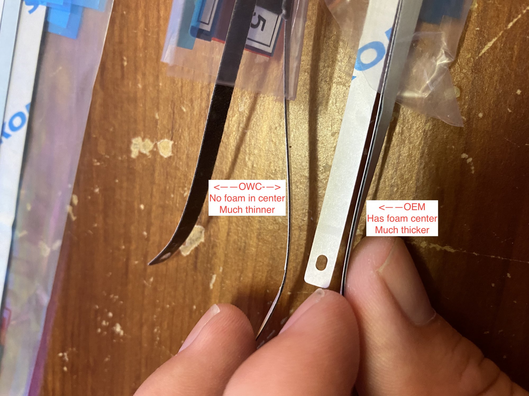 It's hard to tell by the picture as well, but the OWC screen adhesive strips are much thinner than the OEM ones and I believe the strips fail to retain the screen not because of the adhesive, but because of the lack of ability to contact both surfaces fully due to the thinness of the strips.