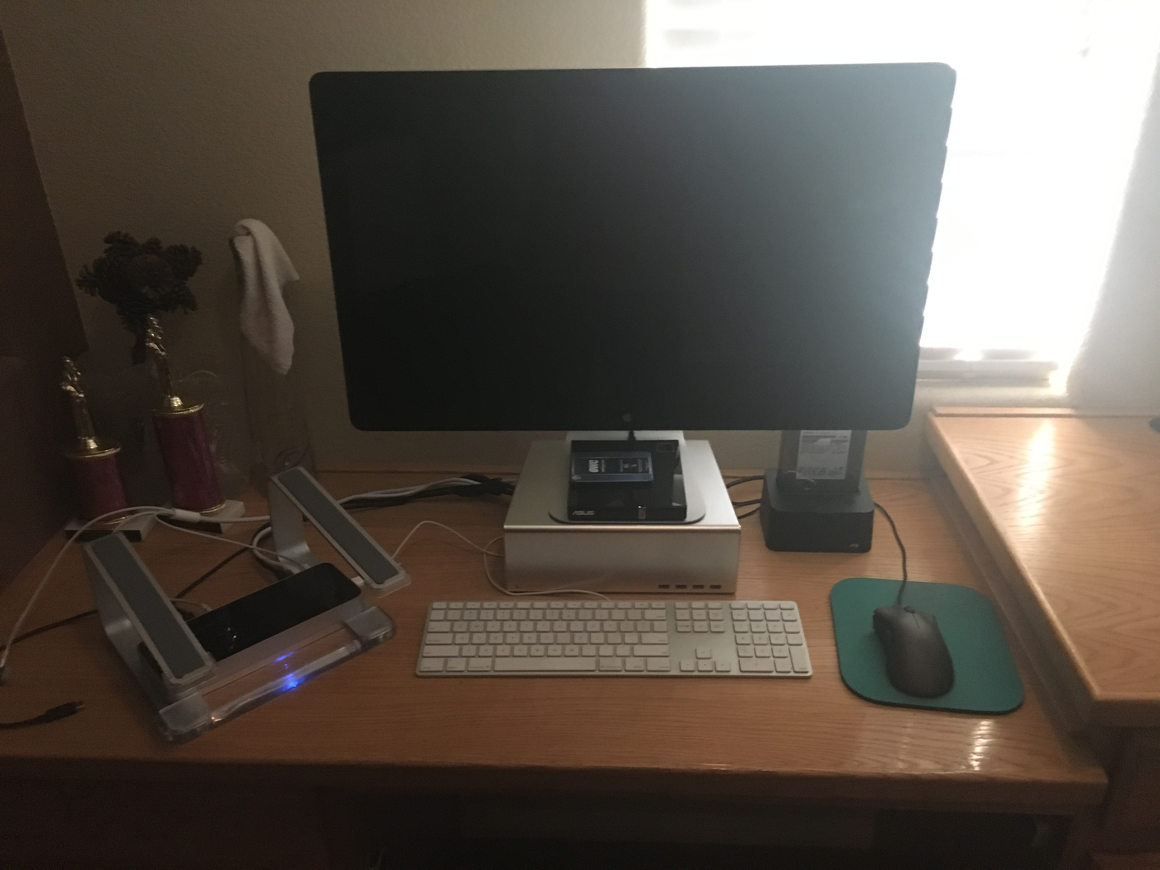 The monitor is the older Mini DisplayPort cinema, which is why I have the dock (plus the Dock has USB 3). The nicest thing is that workstation is available to multiple people in my house. I have a second one in another room because me and my wife can work from home and do on the same day from time to time. We can switch workstations and anyone with a Mac with Thunderbolt can hook up. Since my family runs Macs almost exclusively, even my mom and my sister can use a workstation—and they do.
