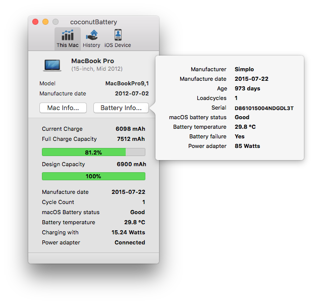 Coconut Battery showing the updated health stats after the full charge.