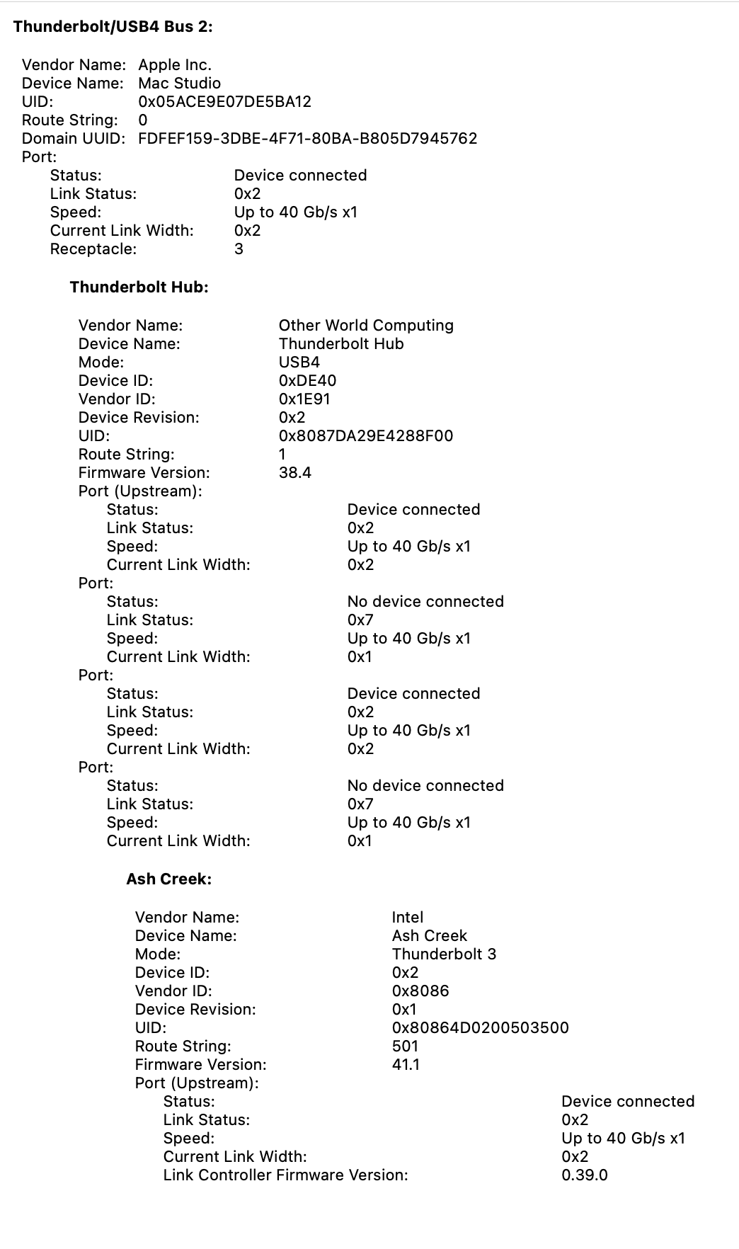 I just purchased the OWC thunderbolt 4 hub that was on sale for $99. I am trying to use it to expand the TB ports on my M1 Mac mini (2020). I connect my M1 mac mini to the OWC TB hub. I test the hub by connecting a NVME external enclosure. It works fine. I now want to connect it to my Studio Max so I can run thunderbolt IP between the 2 macs. So I connect with a TB cable from the OWC TB hub to a Caldigit elements hub connected to my Studio Max. With the OWC TB hub, the connection with the studio max is not recognized. I go to System report, Thunderbolt/USB4 and I see the OWC as a hub, but the port shows no device active. I know it is not cables, as I tried different (good) cables. I can get the connection to be recognized with the same setup and cables if I 1) bypass the OWC and connect direct to the M1 Mac mini. System report shows a connection to the Studio Max. 2) replace the OWC hub with a different hub. The different hub shows a connection with the Studio Max via the caldigit elements. So I conclude that there must be a problem with the firmware or chip used by OWC not to support the complete TB3 protocols including IP over TB. Has anyone else tried to use the OWC thunderbolt hub to connect to another mac? BTW, since the other Studio Max is not recognized, I cant share internet, share files, use IP, so it is broader than just IP over thunderbolt.