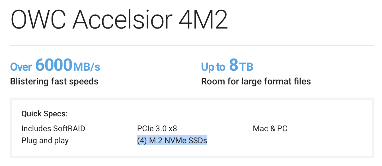 SSDACC4M20GB 0TB OWC Accelsior 4M2 PCIe 3.0 M.2 NVMe SSD Adapter Card for Mac Pro (2010-2012) and PC Towers. Add your own M.2 drives for up to 6000MB/s speed for video editing, VR/AR/MR, extreme gaming, and other high bandwidth needs.