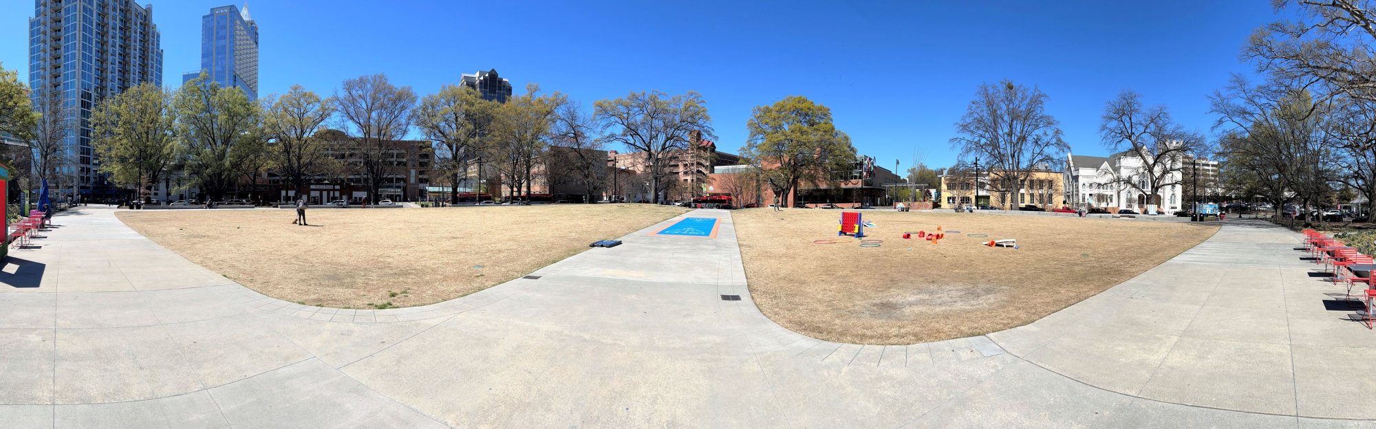 Here is a comparison of a panorama taken with horizontal images vs vertical images. In the first photo, I used five horizontal images to create a final horizontal image. Although I did capture as much of the building as I wanted, the final image seems a bit squashed and just really long. In the second image, I used six vertical images, and the end result is much more balanced with a good amount of sky and grass to flank the building.