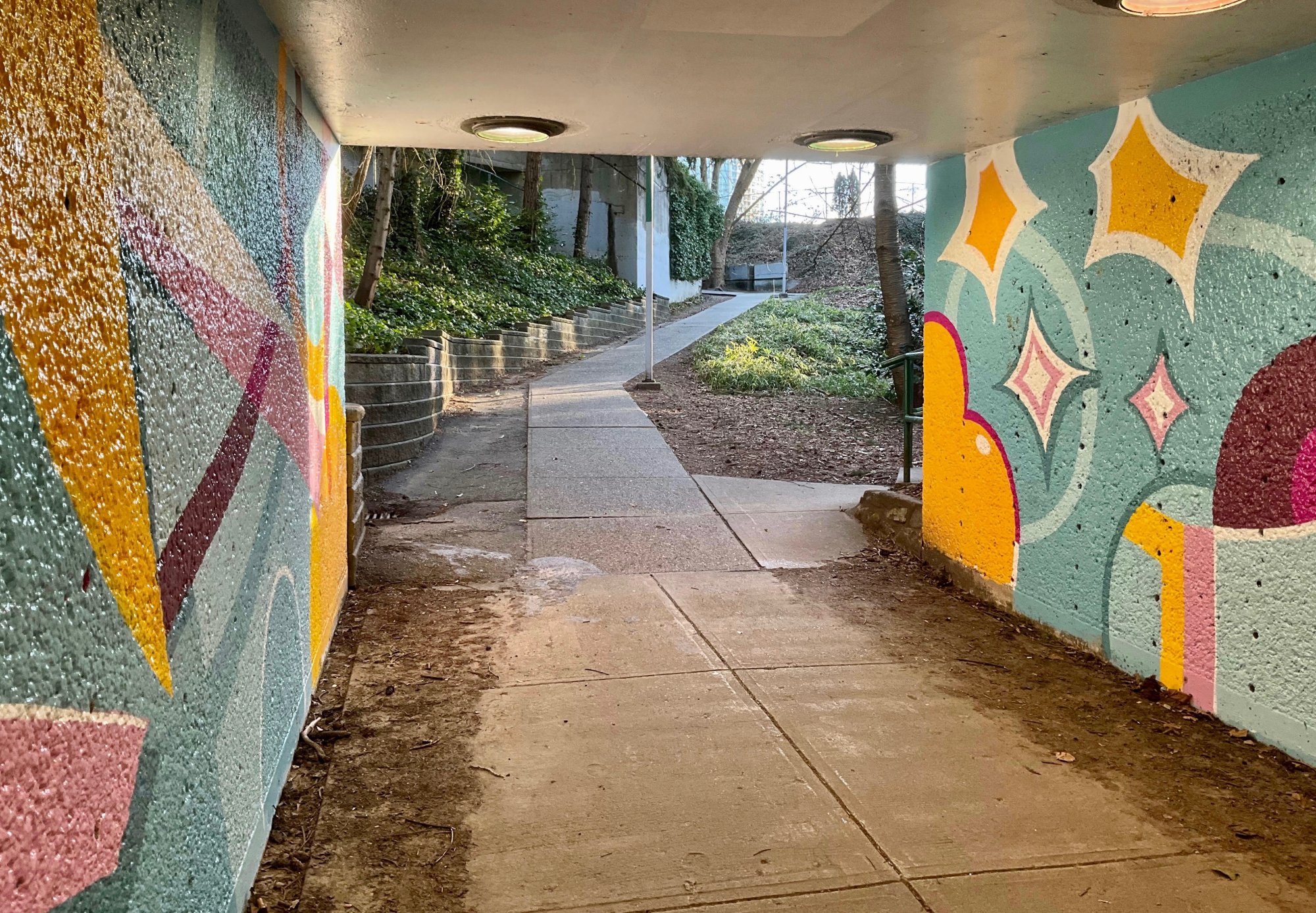 what fun artwork. great composition.. walk back home yesterday morning via the tunnel under a highway .. an approaching view of the destination.