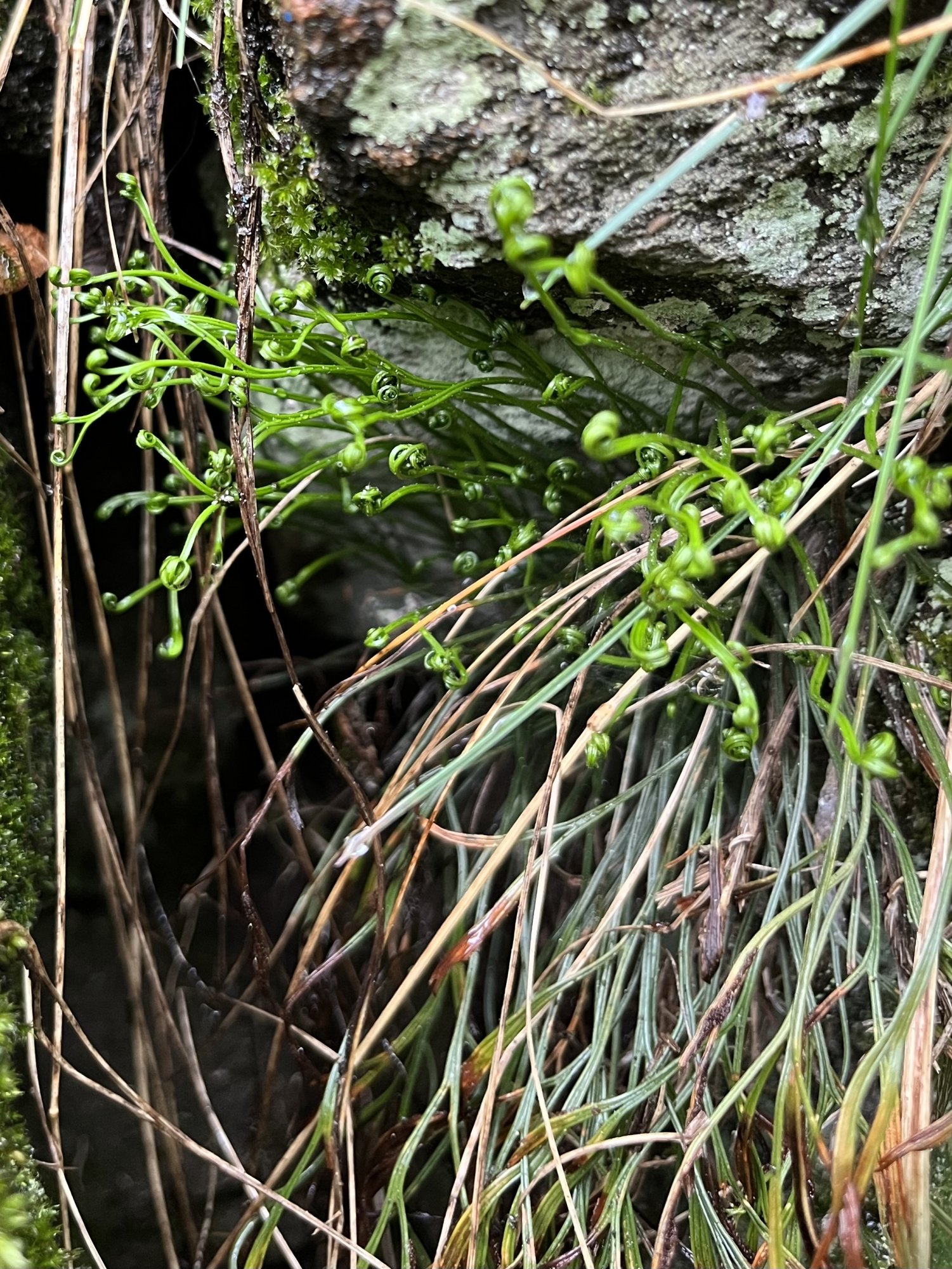 The epipetric Asplenium septentrionale is getting its new leaves. It's an evergreen, though, and its older leaves can be seen hanging.