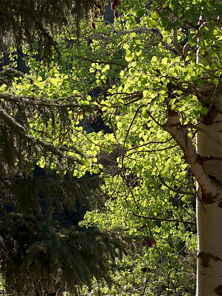 Evening light creates such beautiful colors.Late evening light through young aspen leaves, and danger lurking in the shadows.