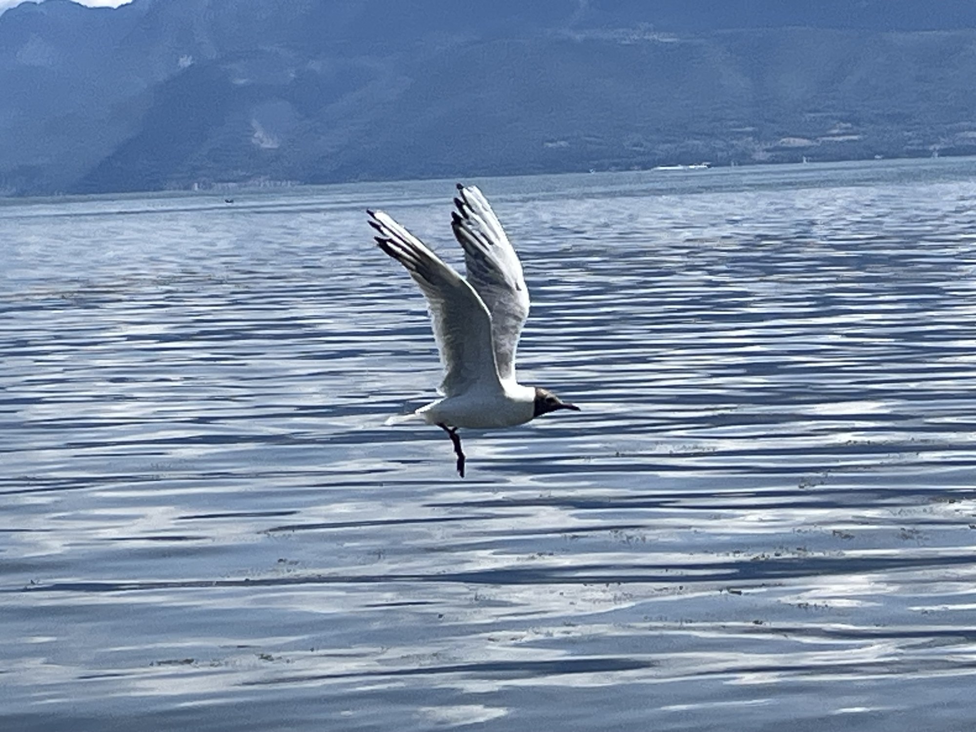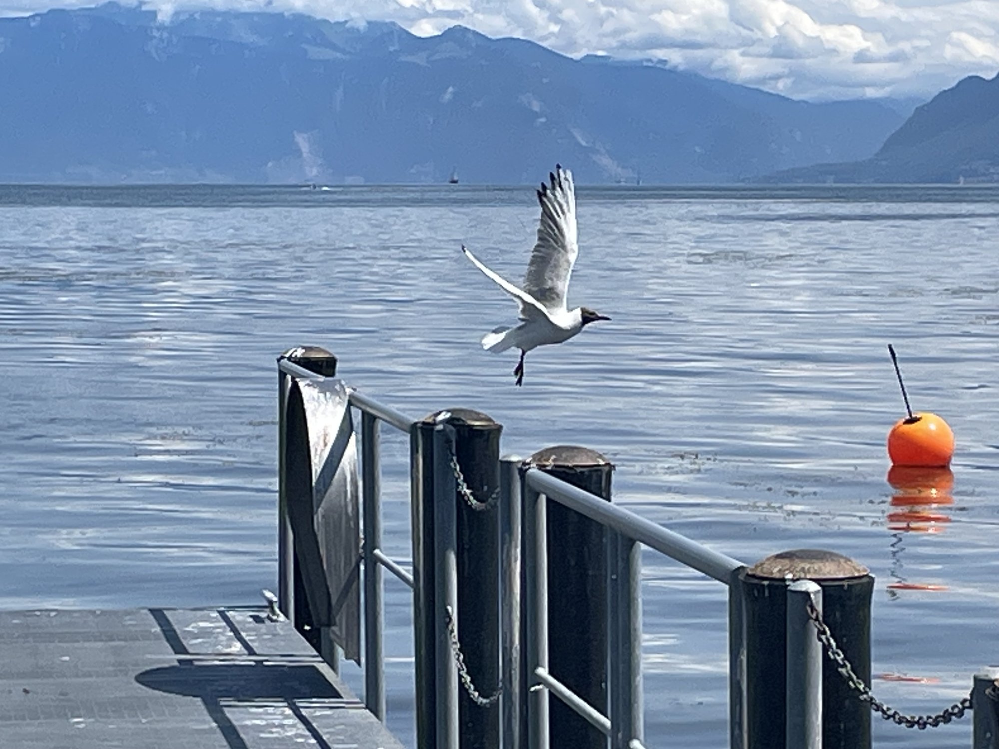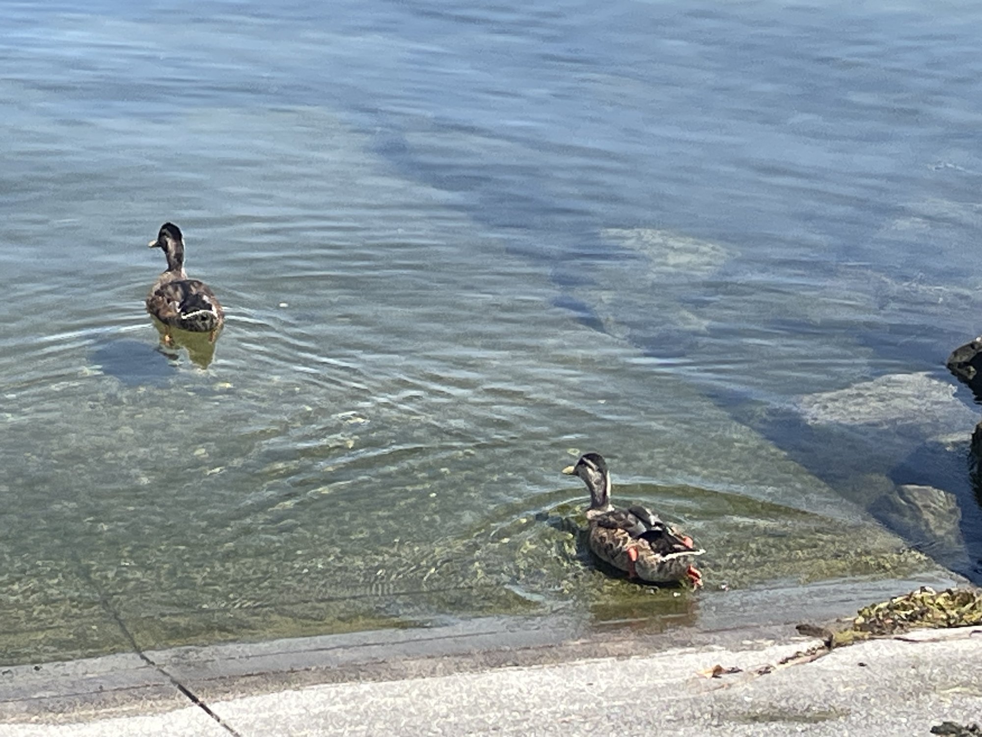 Actually caught in flight with iPhone. Was trying to get both on dock post, but got too close and the nearer one flew. Then caught the other as it took off. Likewise with ducks on shore at water edge.