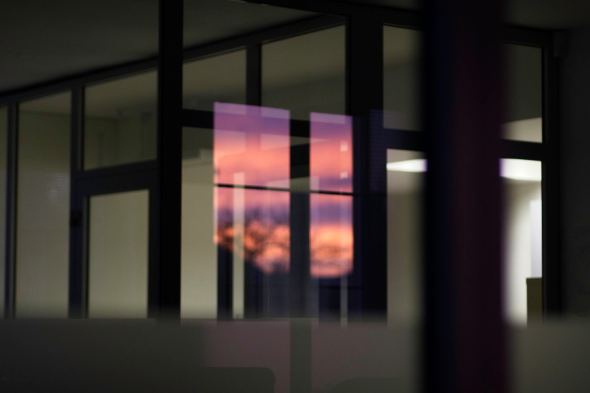 Intriguing layers of the office during a sunrise.