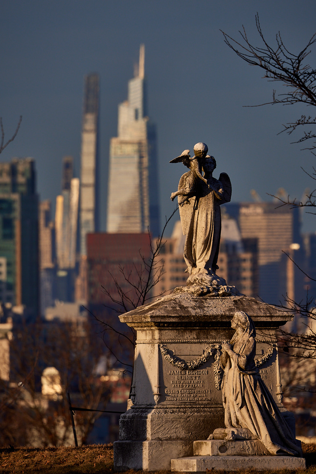 I've made a few versions of this picture in the past, and sometimes I experiment with a very small aperture so the background is less blurred out -- one can e.g., get the Empire State in the picture by just shifting a little bit. But this picture really only works in the winter; by spring enough leaves on branches will really restrict how much of the city background can enframe this tomb.