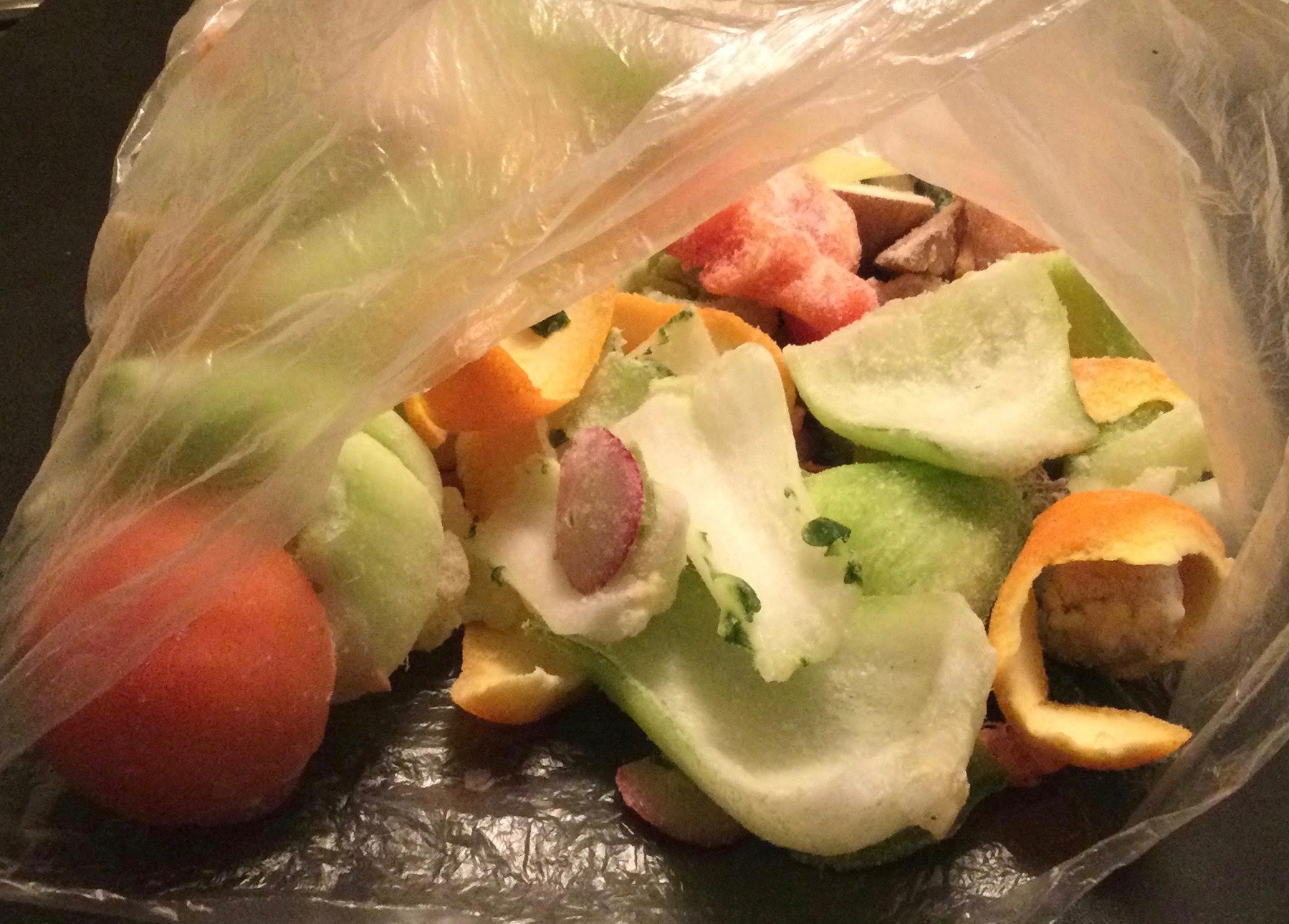 .. looking into a bag of fresh, frozen veggie & meat 'scraps' to be saved for future stocks & soups ..