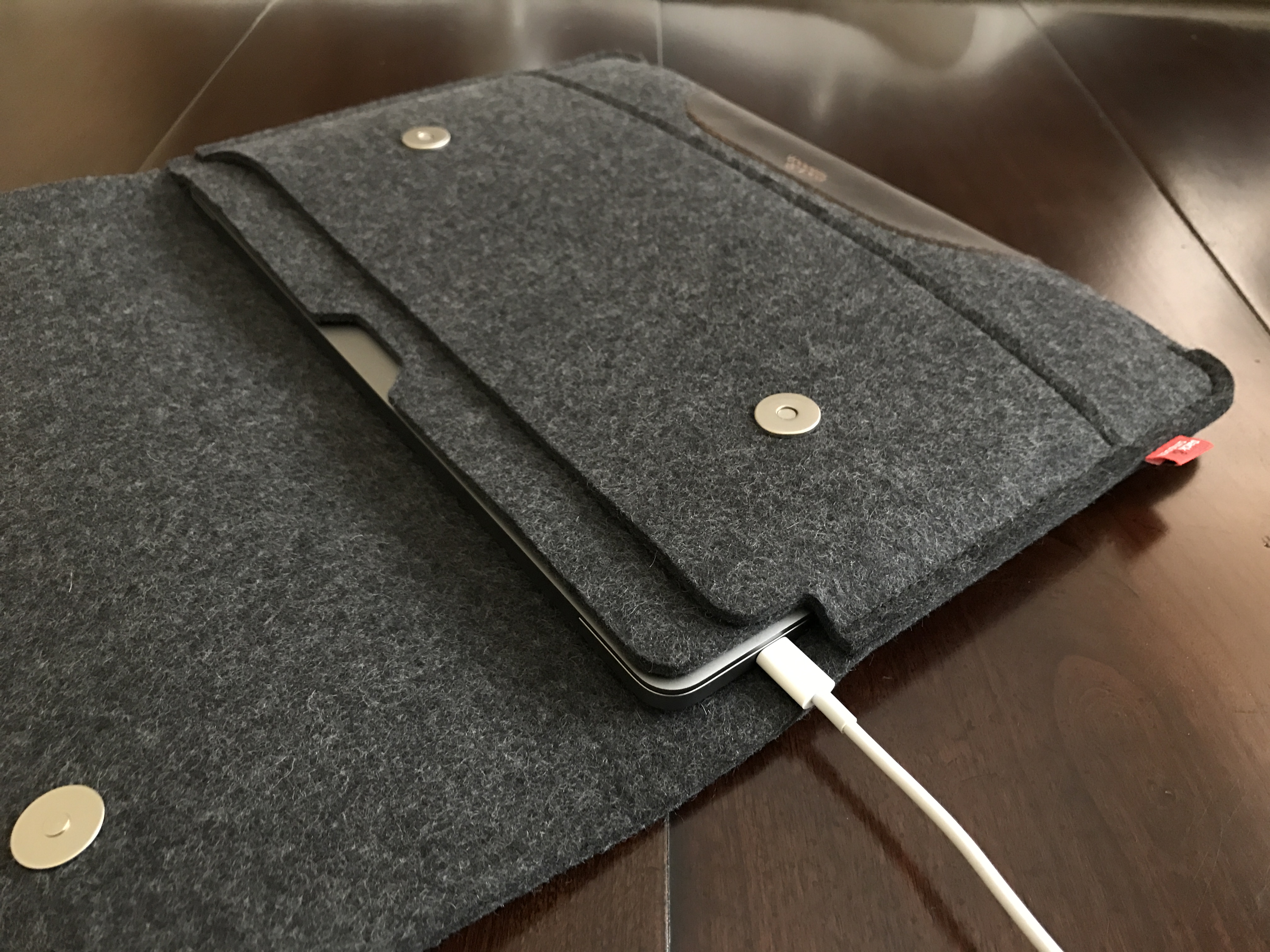 The cut of the sleeve provides an opening to charge the laptop while in the sleeve with the flap closed. The flap is secured by 2 small metal buttons that never come in contact with the actual laptop due to the smaller sleeve where you can place headphones, writing tool, and iPhone.