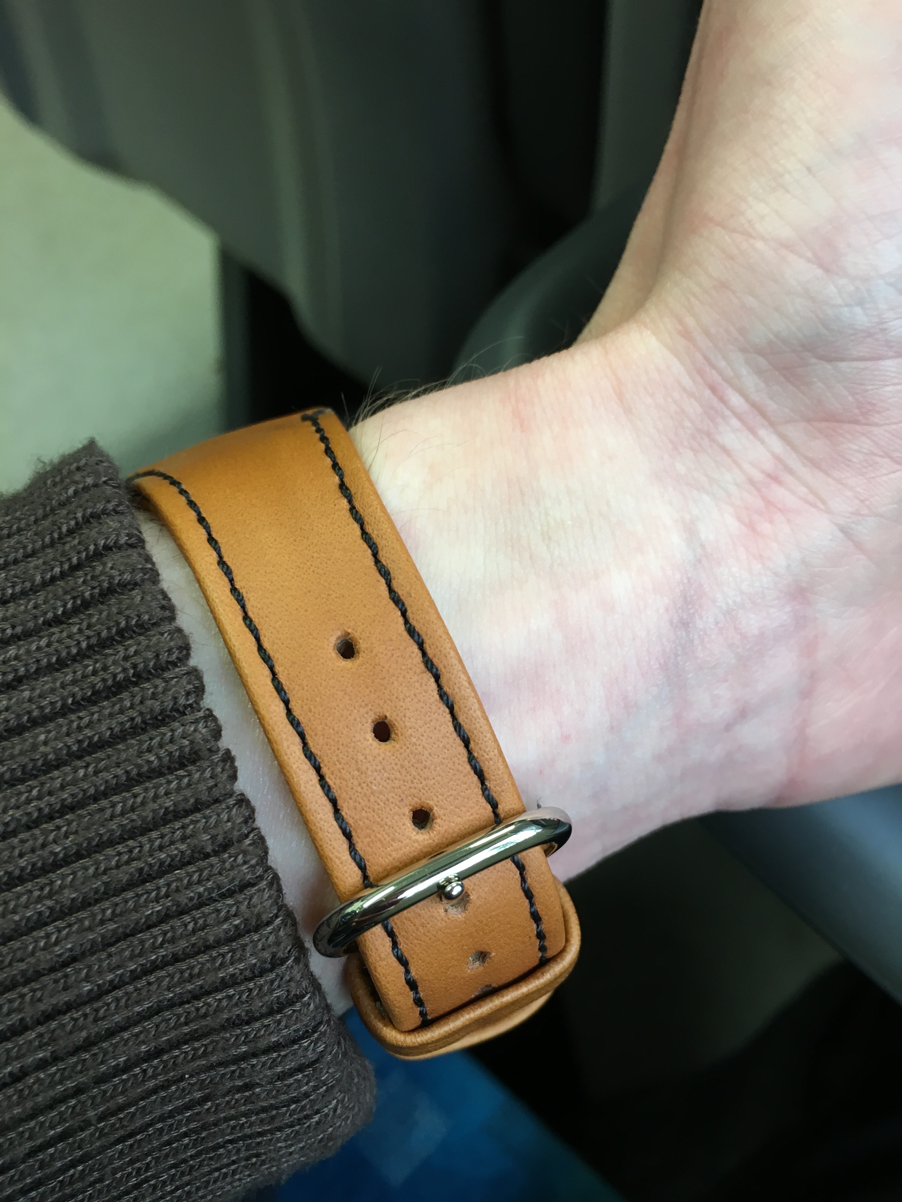 I received the Pad & Quill leather strap yesterday. While it's definitely a premium leather I'm somewhat disappointed with it. My two main grips are it's incredibly stiff. I know leather will soften up, but even after a day of bending it back and forth to loose it, it needs to be about a quarter as still as it is to be comfortable (to me). The strap is also wider than the metal buckle. I can't image why it's like this. Combined with the stiffness it makes it a five minute job to get it on, very frustrating. Finally the whole thing seems a bit oversized for the 38mm watch. Below are some posts with picture comparisons with the new Apple classic buckle strap.