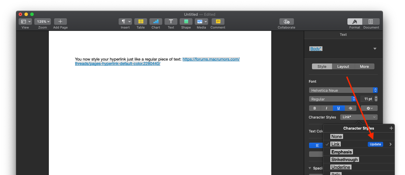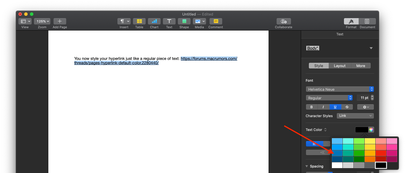 Is there a way to have Pages revert to creating hyperlinks in blue with blue underline?
