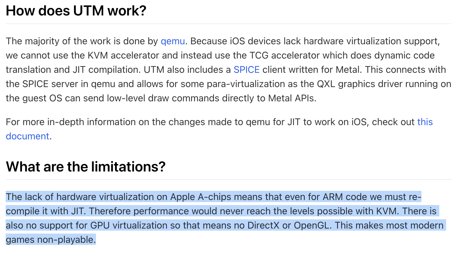 ”The lack of hardware virtualization on Apple A-chips means that even for ARM code we must re-compile it with JIT. Therefore performance would never reach the levels possible with KVM. There is also no support for GPU virtualization so that means no DirectX or OpenGL. This makes most modern games non-playable.”