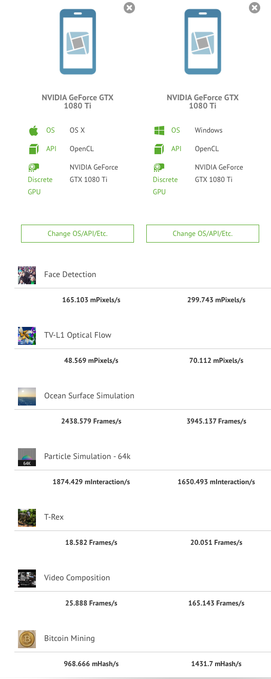 But I feel there is something wrong with OpelCL. Geekbench 4.1 OpenCL test drops out when it hits the second 'histogram' test and fails the benchmark. Luxmark also fails at least the Lobby scene (I get scores for the Ball and Mic). DaVinci Resolve from MacAppStore grinds to a halt in OpenCL mode, and that version doesn't support CUDA (Doh!). Performance in FCPX is also weak.