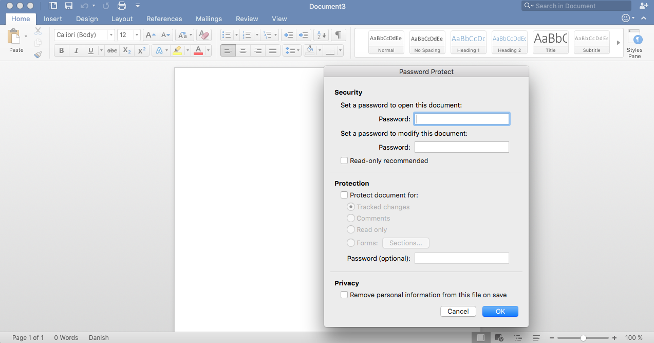 Is it a Word document (*.docx) that you're trying to protect? If it is, and that option doesn't show up, then you probably need to reinstall Office 2016 as the previous reply advised. Since Office 2016 is only available as a download from Microsoft, you might want to download it again using the 2016 Office key you purchased from the Apple Store. Reinstalling Office will not overwrite or remove your documents or templates.