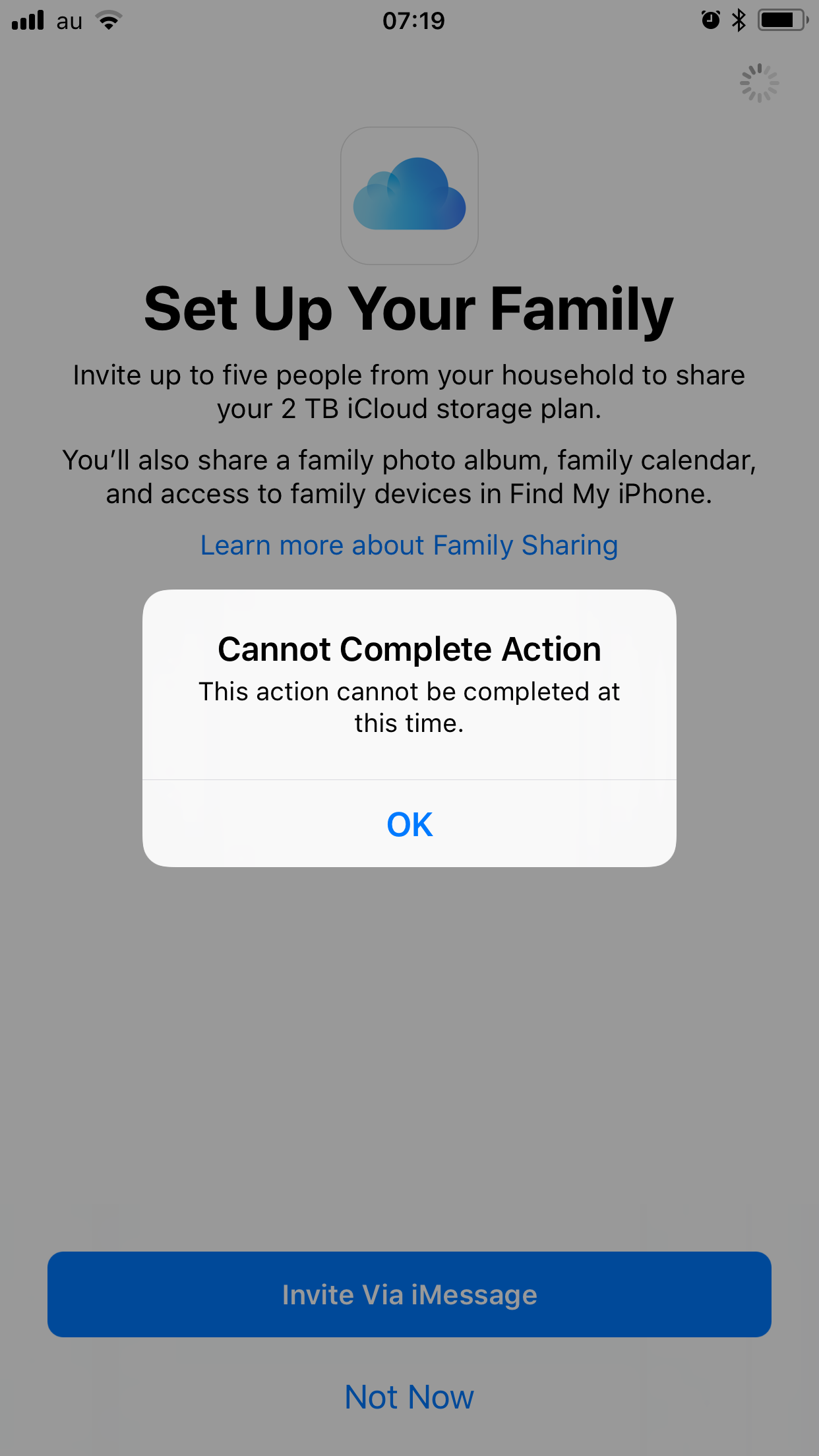 When I select iCloud Storage sharing, and try to send a message to the person, it gives an error message:
