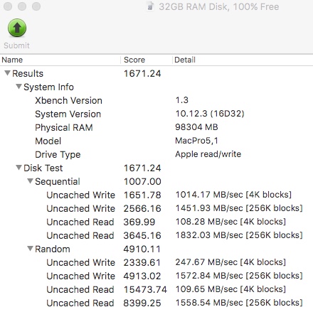 Attached are two benchmarks from my 5,1cMP (very similar to Jed's setup, but with an Amfeltec Squid in Slot 2 carrying an Apple/Samsung 1TB SSUBX with 100% free space). My SSUBX AHCI stick seems to be a lot slower on Xbench than either of your drives (despite BlackMagic results of 1420/1492 MB/s). I don't have an explanation for this but nothing seems wrong (x4 link width and 5.0GT/s link speed). I also ran Xbench on a 32GB RAM disk; the MBP 13.2 results above were stunningly close to cMP RAM disk overall and the MBP SSD was faster at small uncached reads. That is truly impressive MBP performance.