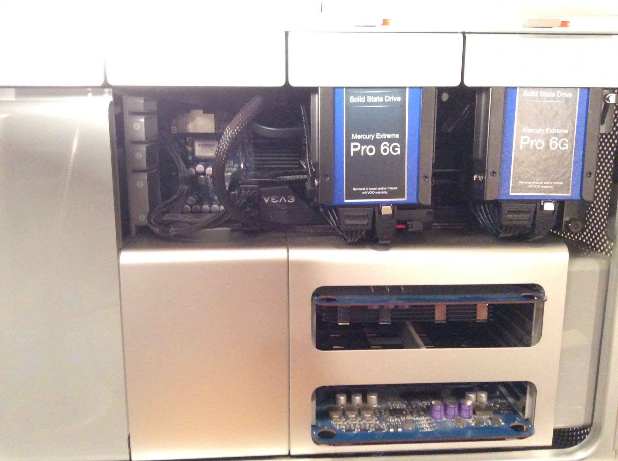 Anyone has any examples of using and securing in place a PCIE Riser cable in their Mac Pro? I have a 6950xt, I want to to put it in slot 1, riser cable in slot 2 to install in a ssd7102.