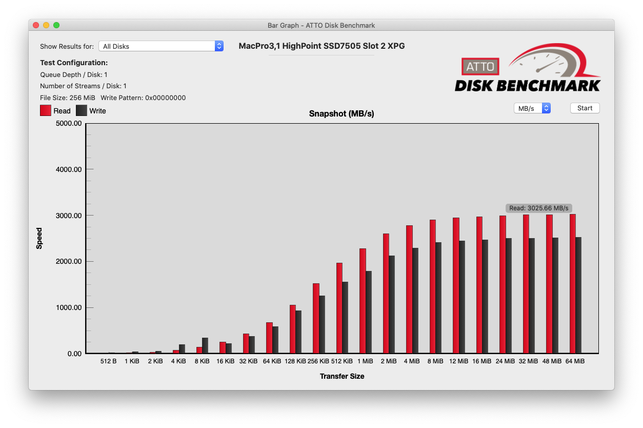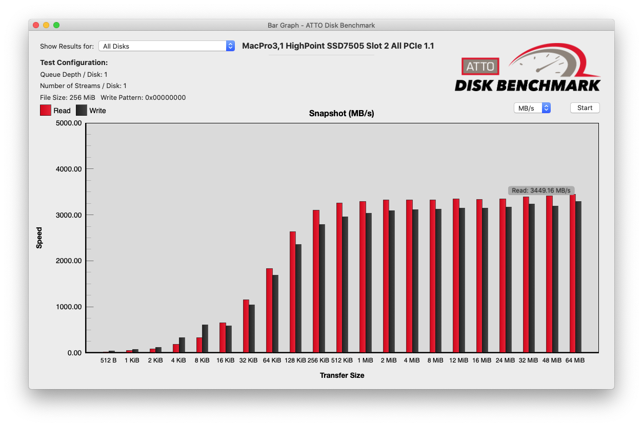 I also did some tests in a HighPoint SSD7505 with multiple NVMe (using ATTO Disk Benchmark.app instead of a RAID) in a Netstor NA255A connected to the MacPro3,1 (PCIe 3.0 x8 slots with PCIe 2.0 x16 upstream)