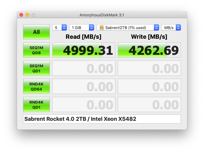 I would have preferred tests using AmorphousDiskMark.app or maybe ATTO Disk Benchmark.app which both can give higher numbers then AJA System Test Lite.app