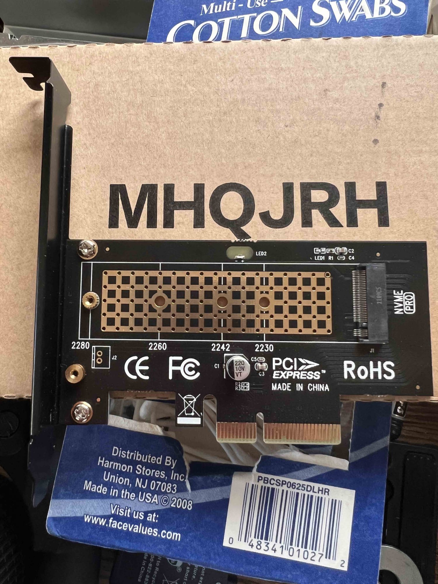 Funnily enough I discovered a PCIe card which handles two NVME drives - while re-organising my home office - which I bought from Amazon on December 8th, 2020. It even has two alloy heat sinks and stick on alloy heat sinks for the two NVME cards. I recall when I bought it, I thought it had to have a SATA based card and an NVME drive - one of each! However it has a cable that connects to another external SATA drive! Quite the "deal" for something that cost $US 21.50!