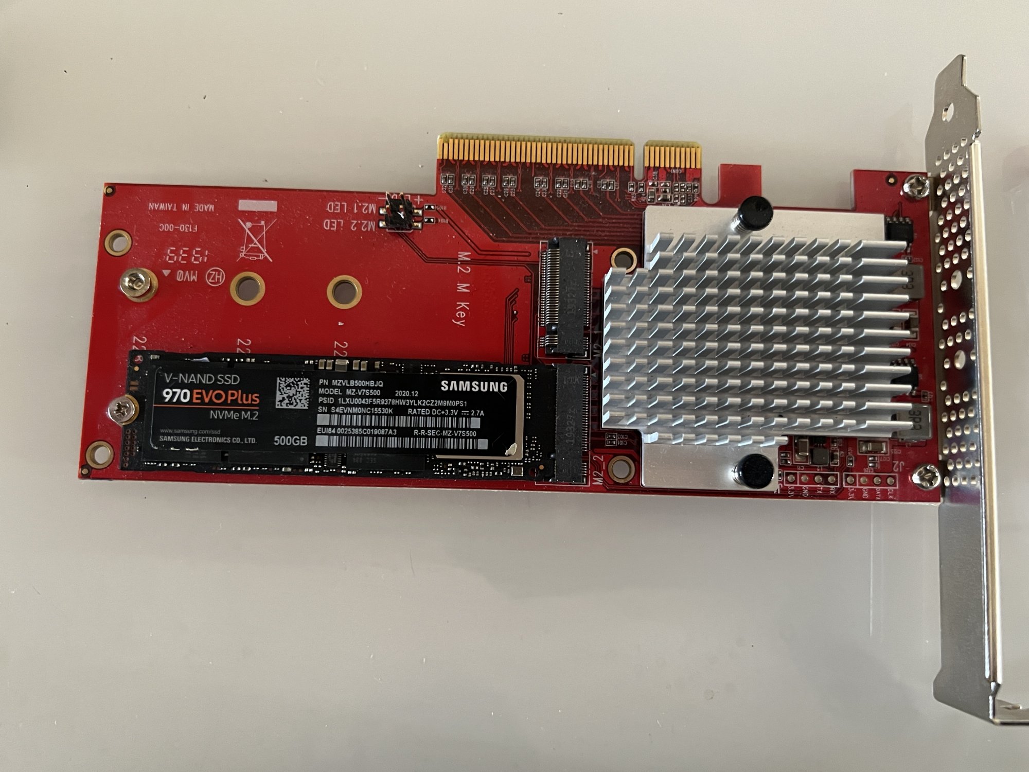It´s the same card.I have the Ableconn PEXM2-130 dual M.2 adapter, which as I understand it is the same/similar as the StarTech PEX8M2E2 that @******* mentioned. I've got a Samsung 970 EVO and a 970 EVO Plus installed and get ~2600MBps from either them. I haven't tested with only one installed, so not sure if it gives higher R/W with one. Likewise, I haven't tested speed tests with both blades at the same time.