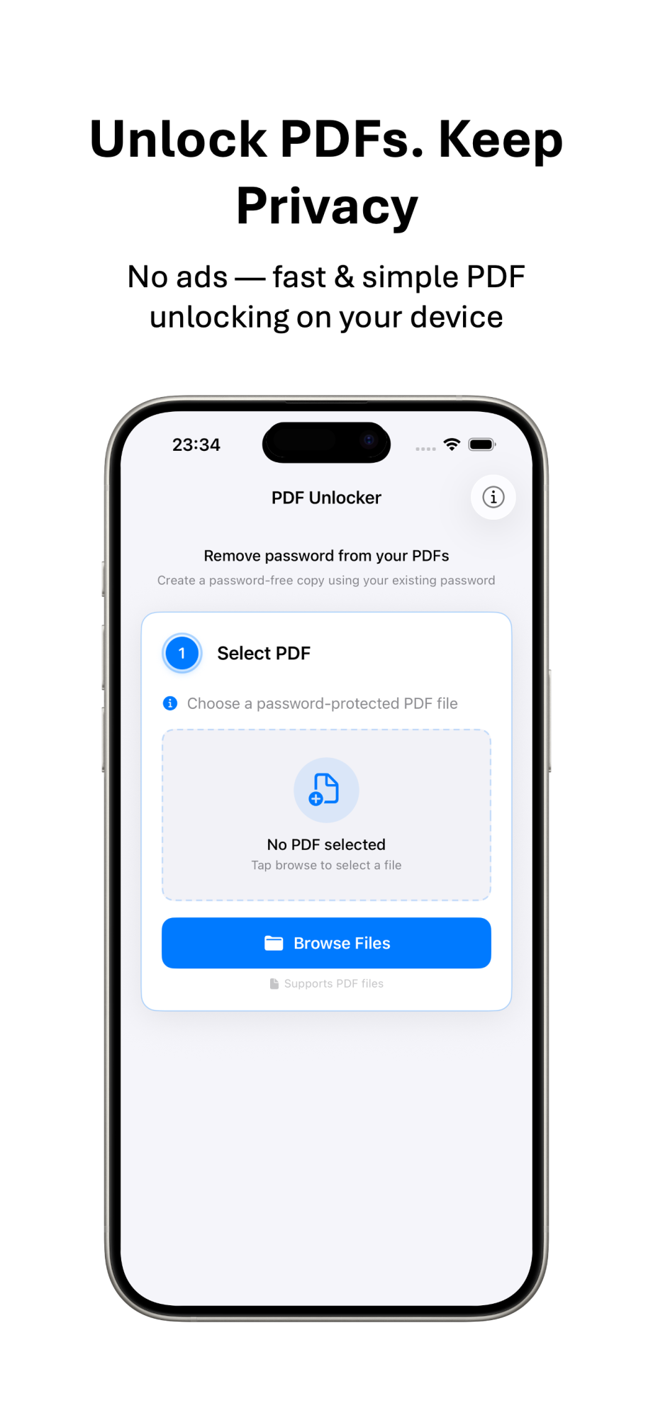 PDF Unlocker removes password protection from your PDFs — entirely on your device. No uploads. No servers. No ads. No tracking.