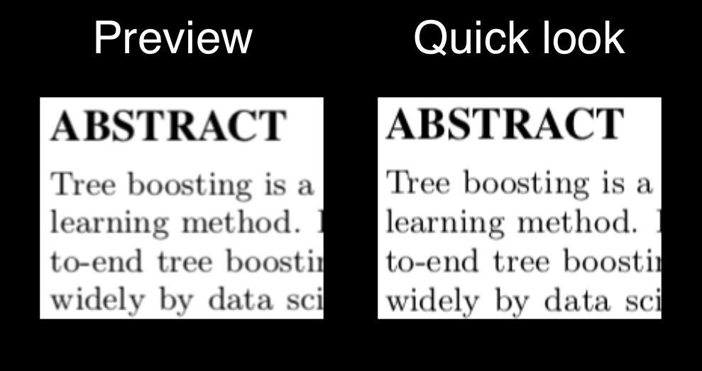 Quick Look renders text clearly at virtually any size whereas Preview is blurry at anything < 200 % zoom or so.