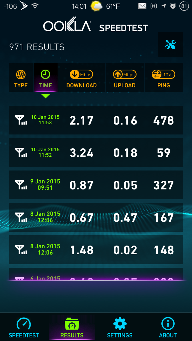 but basically everywhere else I got from day to day I average 5-10mbps and have seen up to 25 in other areas.