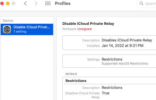 To reenable iCloud Private Relay, remove the profile from System Preferences – Profiles.
