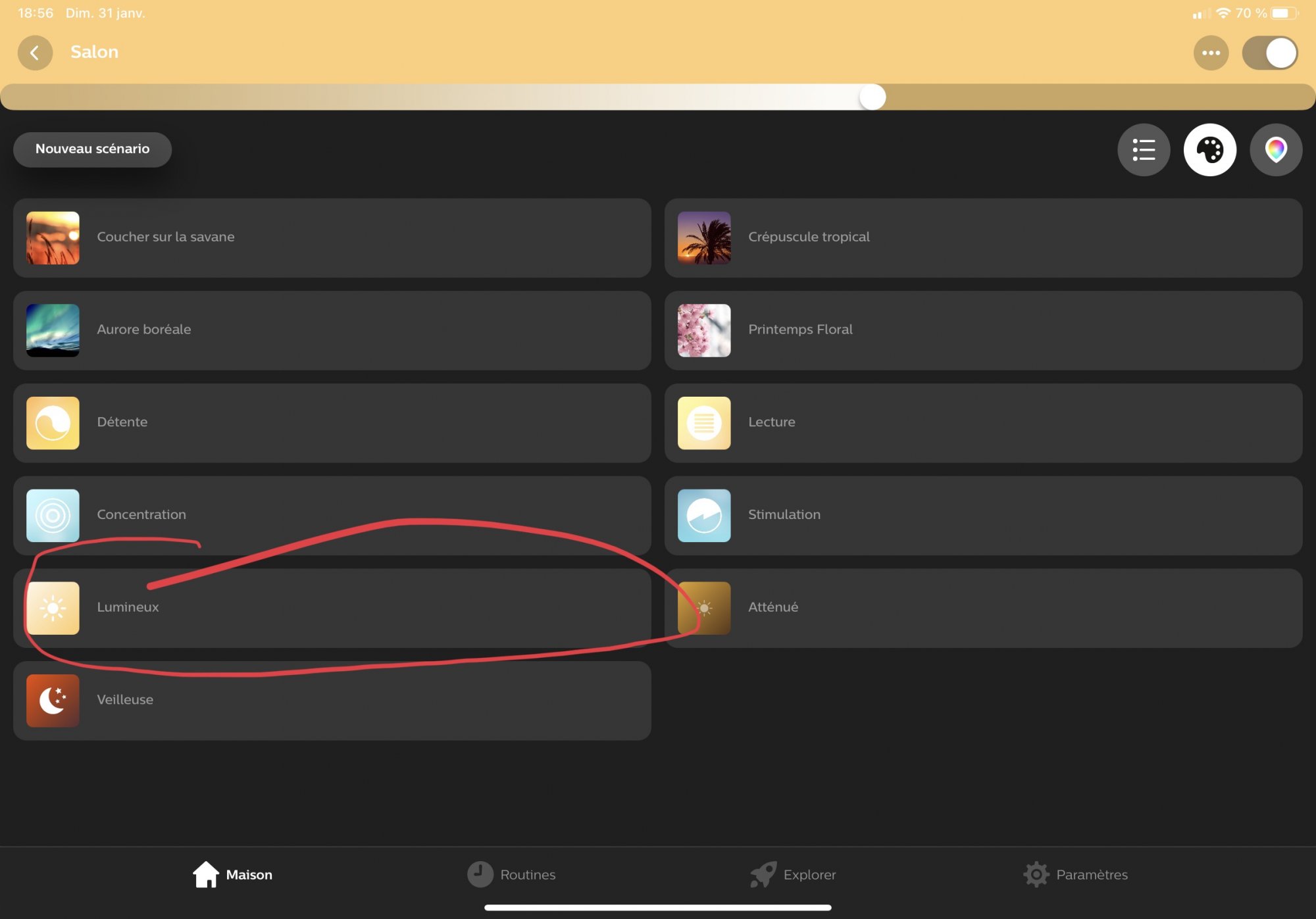 - Another cool feature is you can easily turn on/off which parameters are included in the scene. So you could make a scene that's only the color blue, and not include the on/off or dimmer state of the lamp. So when you play the scene only lights that are already on will turn blue, and maintain their dim level.