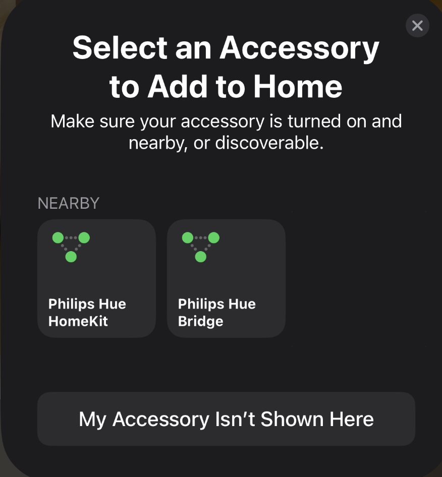 Click on the "More Options..." then select "Enter code..."How are you guys pairing your bridge in the Home app? When I click Add Accessory it is asking me to scan a QR code. My bridge only has a number in the ___-___-___ format, but no QR code. I am extremely frustrated. When I try to use the Hue app I get the Matter Is Unavailable error.