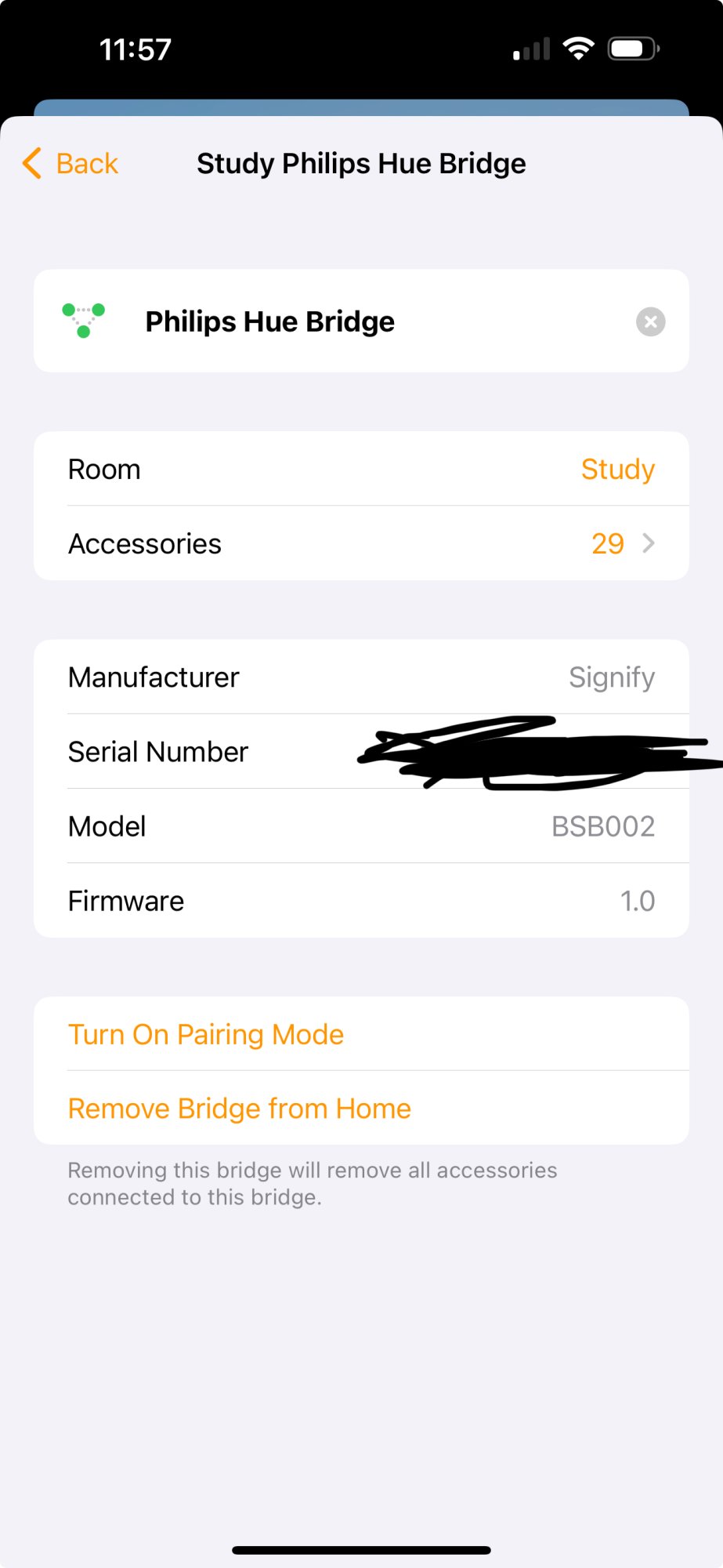 If when you look at the bridge properties it shows the icon and a link to the Hue app then that is HomeKit. If that is missing as in the image below then it is Matter.There seems to be no clear information. Which version of Hue bridge is on Matter? Apparently in Hue app says it be updated automatically? How am I know if I am on Matter or not?