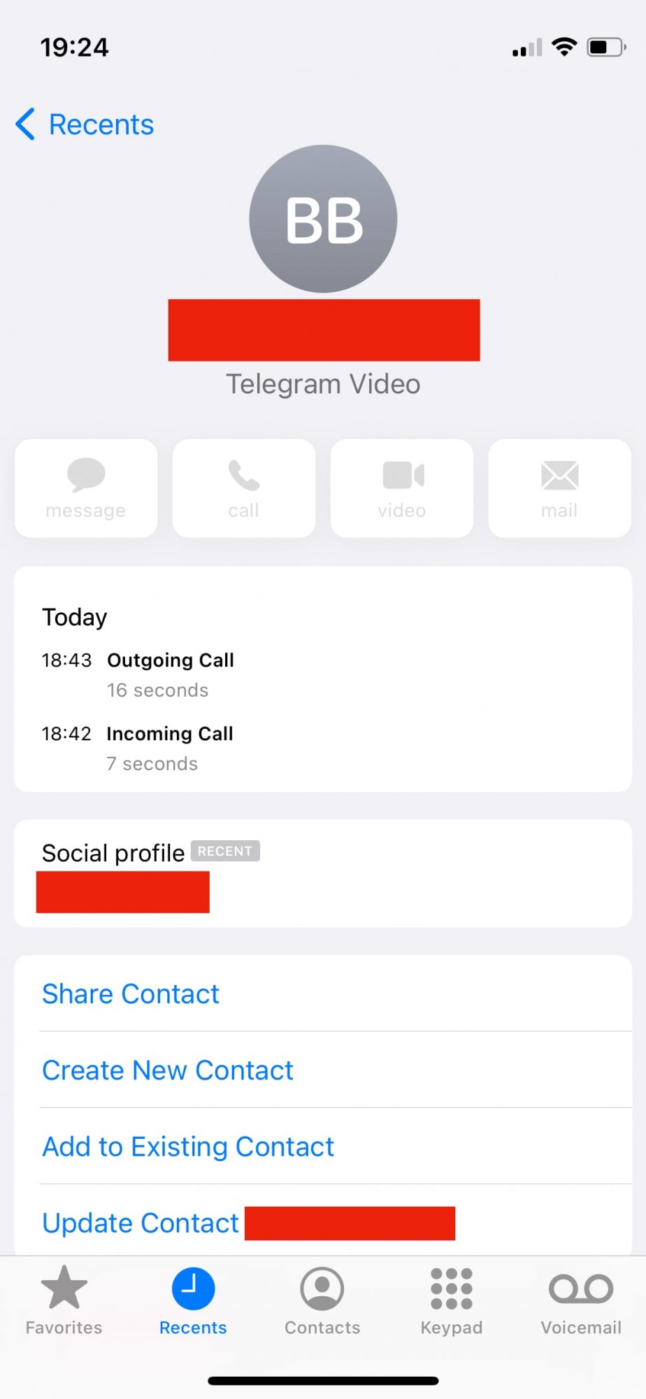 In Phone app (iPhone) under Recent tab there is a list of all recent call including ones from third party like Telegram and WhatsApp. If I expand on any call to get more info there are four big action you can take. Those actions are grayout on any entry from Telegram. Works fine on regular calls or Whats app.