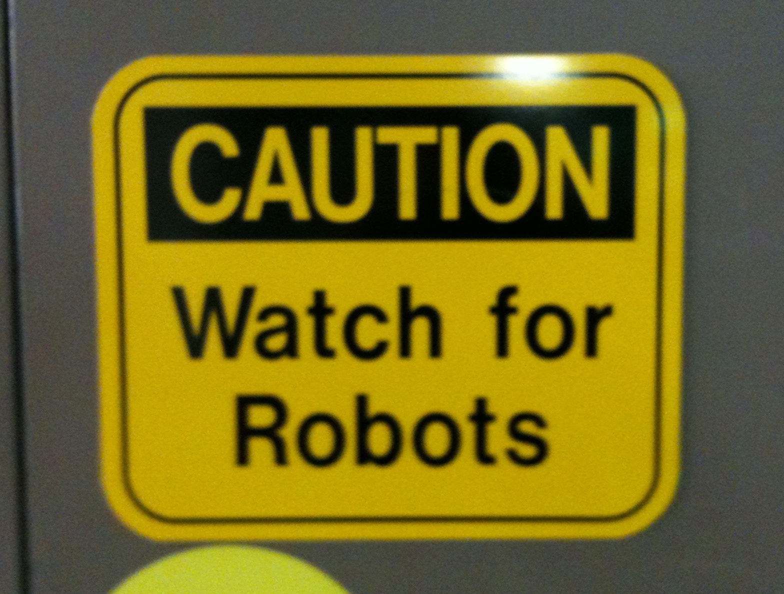 We always think of robots as humanoid looking machines, but these robots were automated flat bed carts that delivered boxes of supplies to various departments in the hospital. There was a crossing point of the main hallway I used all the time, the carts would come out of Central Supply and go into another area. Lights and alarms kept us safe.