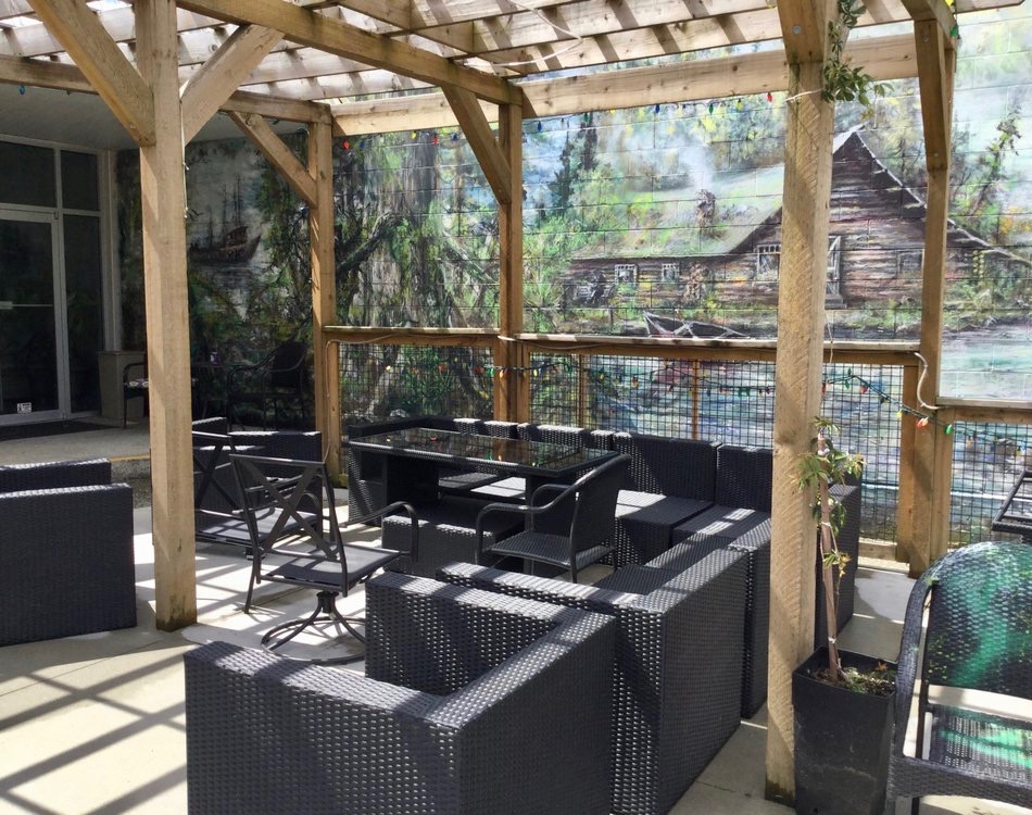 A bar's outdoor patio setting with an Indigenous artist painted wall (Hope, BC).