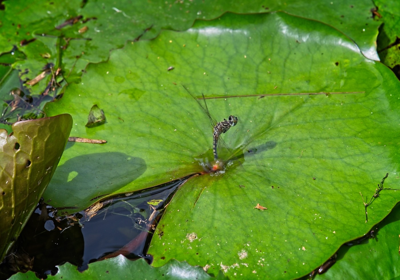 I watched this dragonfly hover and drop its 'tail' many times into the water at the center of the pad. Fertilizing or depositing eggs ?