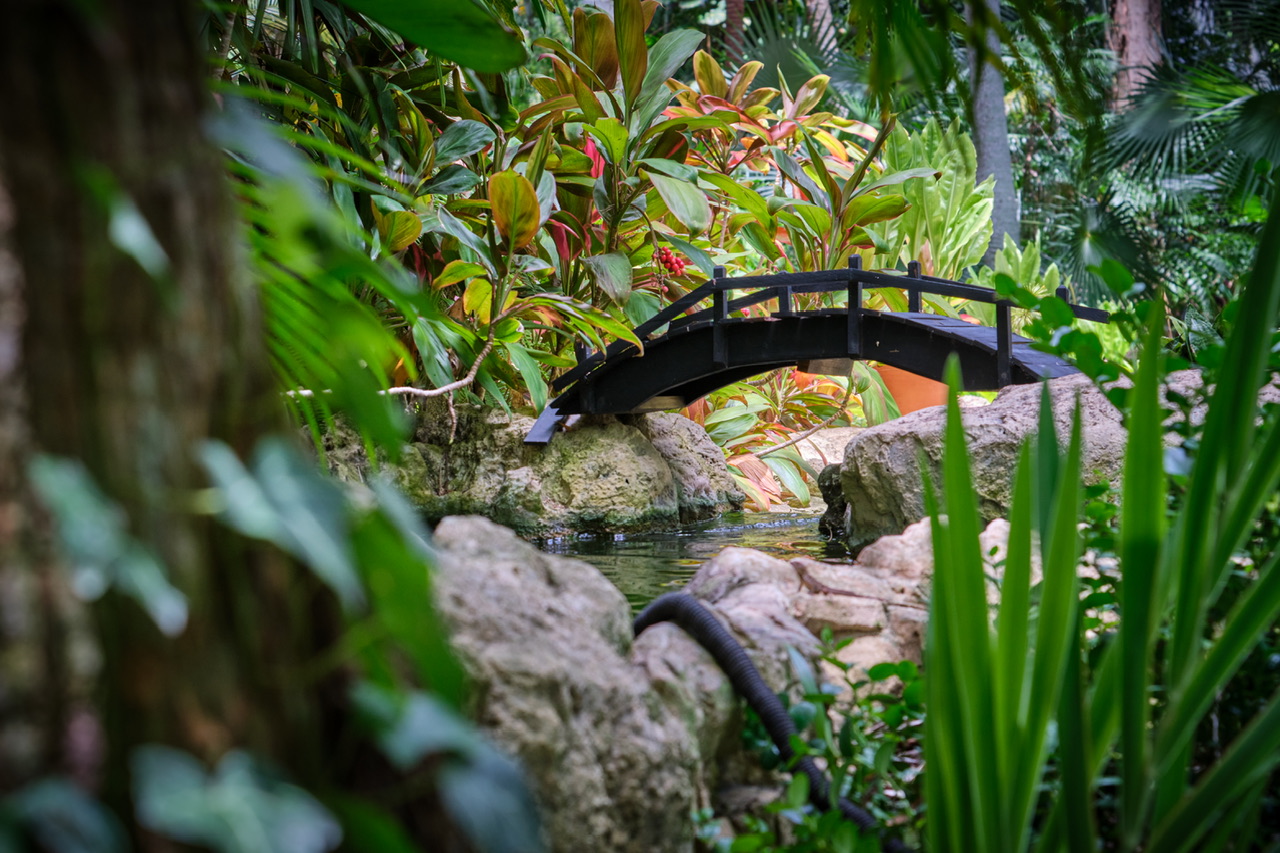 Garden hose to fill the water feature at Sunken Gardens.Is that a snake over the rocks? Looks like a fat cottonmouth.
