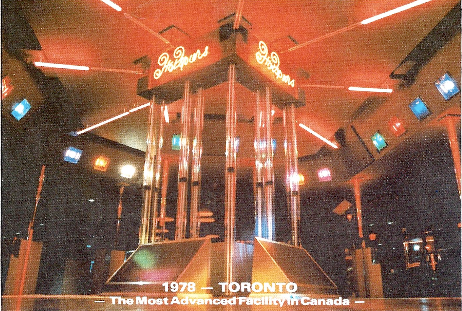 The most complex lighting system I designed and installed. 8 channels of 8 Neon segments built around a building column. 8 segments individually controlled to chase in various patterns, then by flipping switch, 8 'donuts' would chase the same way. Vertical neon tubes were installed and supported inside 4" pyrex chemical drain pipes. They said you couldn't dim neon, but I did! 15" JBL woofers mounted in floor cabinets that vented under dance floor to outer floor vents. Only photo I have was taken from a Toronto Hospitality Magazine ad for the interior design company.