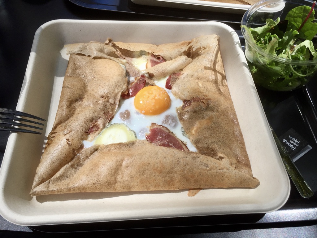 It is a crepe bought as 'fast food' at 'cafe' one lunchtime in Bordeaux when on holiday in August 2016. I think of it as an upmarket all-breakfast buttieLooks nice, what is this?