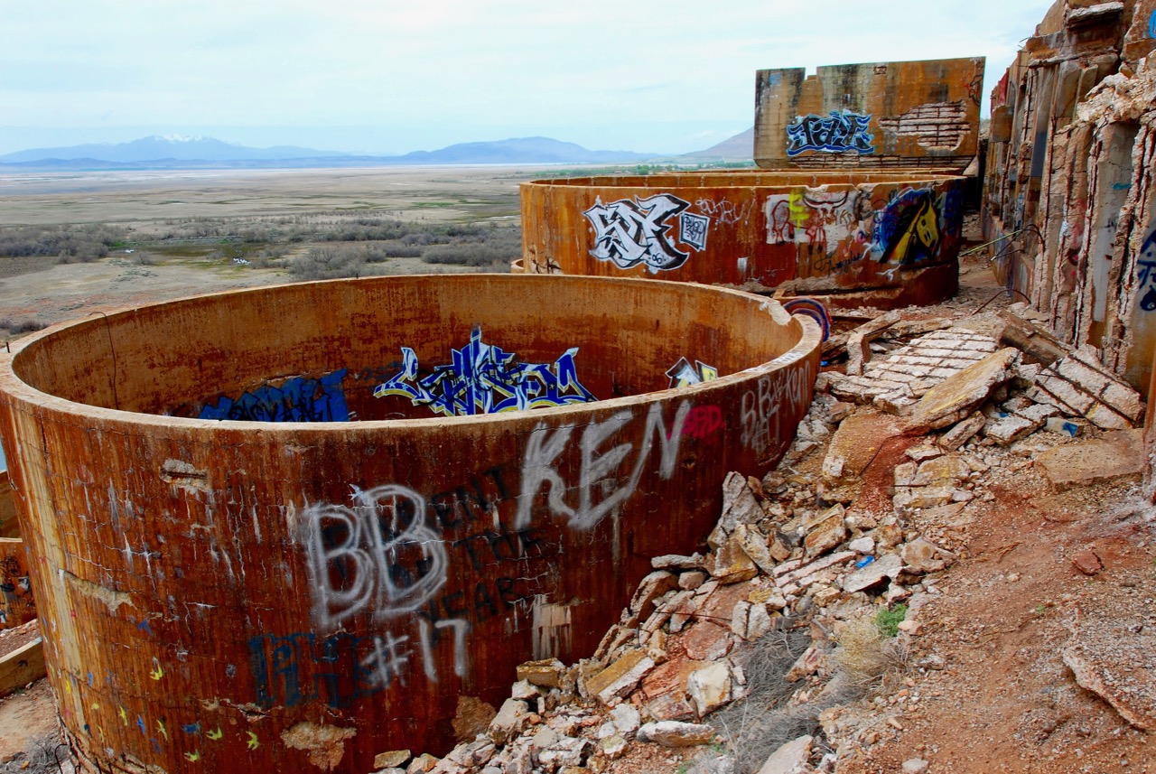 Graffitied ruins of the Tintic Standard Reduction Mill in Goshen, Utah. The big round concrete tanks are leaching tanks.