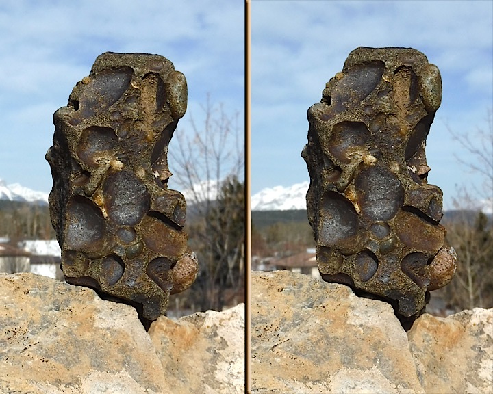 Well never was good at these type fo 3D images, and my current itchy hayfever affected eyes (albeit less than years gone by) make it even less likely but nice image.A small piece of conglomerate I picked up on a hike earlier this week. Seems to be some sort of a natural concrete.