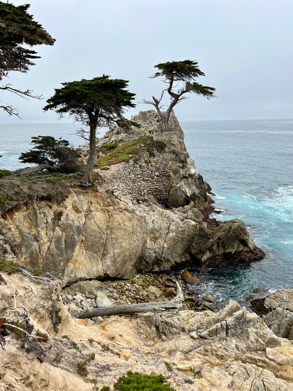 Here is a close-up shot. Recent storms knocked down an entire section of the iconic tree. The Lone Cypress lost its left limb during an extremely powerful storm in 2019.If you look closely you can see an attached cable holding down the tree. The separated tree branch has been left on the shoreline. The tree itself is very healthy. It is said to live for at least another 100+ years.