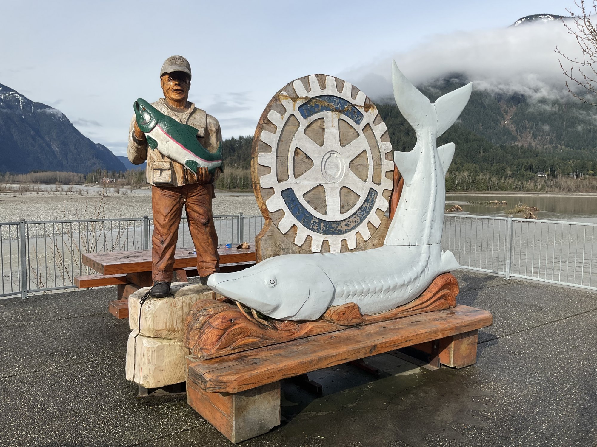 Refresh wasn't complete, they failed to refresh the Rotary symbol or they should have had the local club do it.Chainsaw wood sculpture set, refreshed recently, located at Centennial Park view point, Hope, BC - mountain and Fraser River background (27 March/22).